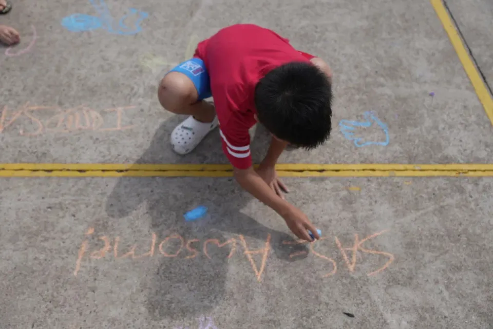 Puxi elementary school students sent their kind wishes to their pals and wider community by writing positive messages on the sidewalks on campus. Students also made some new friends along the way.